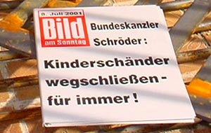 Die Initiative gegen Gewalt hat sich durch die Aussage unseres Bundeskanzlers Schröder inspirieren lassen und ein Mahnmal gegen Kindesmissbrauch konzipiert. Dem Betrachter zeigt sich ein quaderförmiger Käfig (im Original 3m x 3m x 3m, Modell im Maßstab 1:10) aus Eisen ohne irgendeinen Zugang. Im Innern des Prangers steht ein Bett aus gleichem Material, worauf die „Bild am Sonntag“ mit dem bekannten Zitat des Kanzlers liegt. Mit dem Mahnmal beabsichtigt die Initiative keine bestimmte Forderung zu vertreten. Die Installation soll vielmehr die Menschen zum Nachdenken anregen und für das Thema sensibilisieren. Kindesmissbrauch zu verhindern muss letztlich unser aller Bestreben sein. Dazu soll das Mahnmal Anstoß geben und Denk-Prozesse in Gang setzen helfen. Einen Standort für das Mahnmal hat die Initiative bereits gefunden: vor dem Freizeit- und Erholungszentrum Wuhlheide in Berlin-Köpenick.