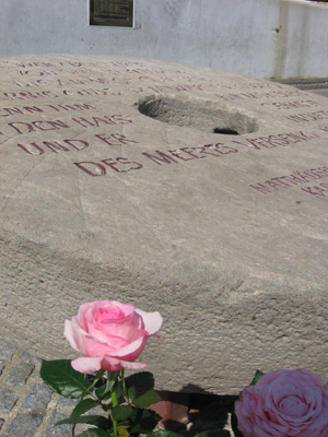 ![]() ![]() Fotos: Frank Hügle, Karlsruhe Am nächsten Tag hatte jemand den "Mahnenden Mühlstein" mit einem Topf Rosen dekoriert. |