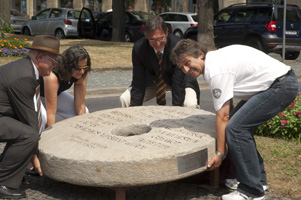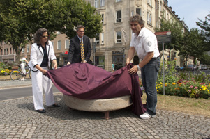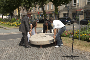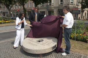 Enthüllung des "Mahnenden Mühlsteins" v.l.n.r.: Maria Lampl, Vorsitzende des Opferhilfevereins AVALON, Oberbürgermeister Dr. Michael Hohl und Johannes Heibel von der Initiative gegen Gewalt ... e. V. Nordbayerischer Kurier vom 23.07.2010, Seite 14 |