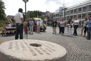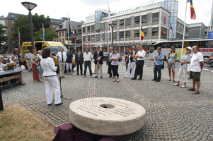 In seiner Rede verglich Johannes Heibel symbolisch das Gewicht des 1,4 t schweren Mühlsteins mit der Last der Opfer von sexualisierter Gewalt. Er bat Oberbürgermeister Dr. Hohl, den ev. Pfarrer Hilmar Sommermann (der Herr links mit Hut) und Frau Lampl, ihm dabei zu helfen, den Mühlstein anzuheben. Heibel wollte damit demonstrieren, wie man Opfern dabei helfen kann, ihre schwere Last besser (er)tragen zu können. Alle Anstrengungen jedoch halfen nichts. Der Stein konnte nicht einen Millimeter bewegt werden. Heibel erklärte daraufhin, dass wir es nur gemeinsam schaffen können. | |