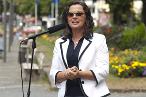 Maria Lampl (AVALON) hier bei ihrem Grußwort Ihr Statement zu unserer Aktion: " Stadt Bayreuth, Initiative gegen Gewalt und AVALON haben zusammen gearbeitet und ermöglicht, dass der 'Mahnende Mühlstein' in Bayreuth Station machen kann. Die Presse hat die Aktivität verfolgt und so kamen in kurzer Zeit sehr viele positive Reaktionen, die den Mühlstein gerne für immer in Bayreuth hätten.