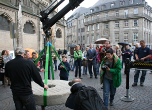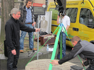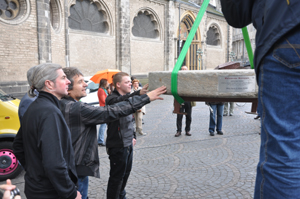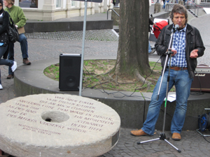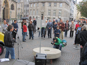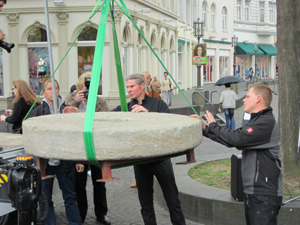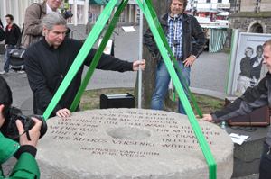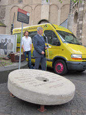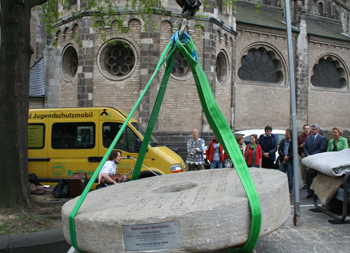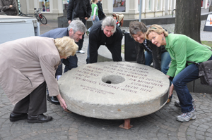 Der Mühlstein soll auch die Last der Opfer symbolisieren. Auch in Bonn animierte Johannes Heibel Vertreter der Stadt ihm dabei zu helfen, mit ihm gemeinsam diese Last zu tragen. Die 1,4 t waren aber für die fünf Personen zu schwer. Der Vorsitzende der Initiative bat daraufhin alle Besucher der Veranstaltung dabei mitzuhelfen den Opfer beizustehen und sie somit, zumindest so gut es irgendwie geht, zu entlasten.