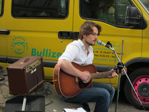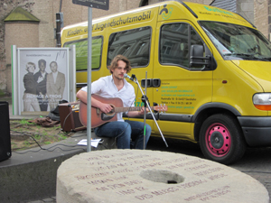 Gitarrist und Sänger Christian Kriegsmann, Saitenschule Bonn, eröffnet die Veranstaltung.