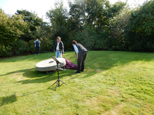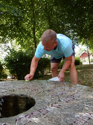 Pierre Heibel bei der Reinigung des "Mahnenden Mühlsteins"