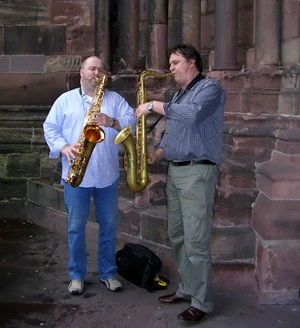Die Saxophonisten Uwe Drescher (links) und Michael Zolg (rechts) eröffnen die Veranstaltung mit "Mercy, Mercy, Mercy", von Jo Zawinul |