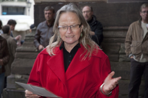 Ursula Knöpfle, die Frauenbeauftragte der Stadt Freiburg, eröffnet die Auftaktveranstaltung vor dem Freiburger Münster.