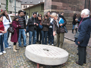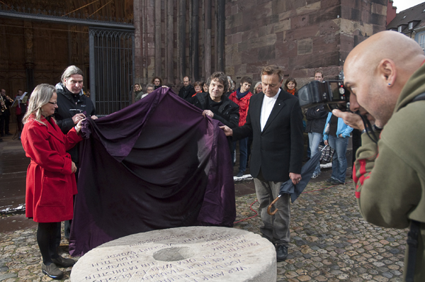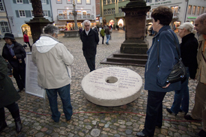 Enthüllung des "Mahnenden Mühlsteins" vor dem Turm des Freiburger Münsters. v. l. n. r.: Frauenbeauftragte Ursula Knöpfle, Steinmetz Bruno Harich, Johannes Heibel, Vorsitzender der Initiative ... e. V. und Dompfarrer Claudius Stoffel |