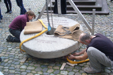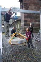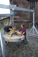 Versetzung des "Mahnenden Mühlsteins" vor dem Hauptportal des Freiburger Münsters durch den Steinmetzbetrieb Wolfgang Beck, Freiburg |