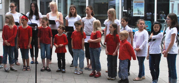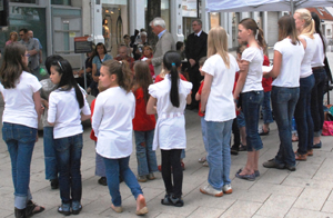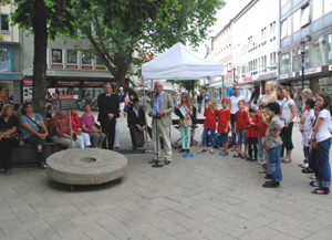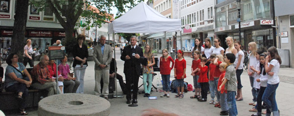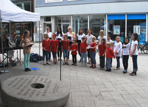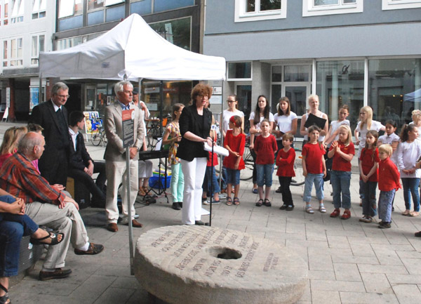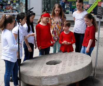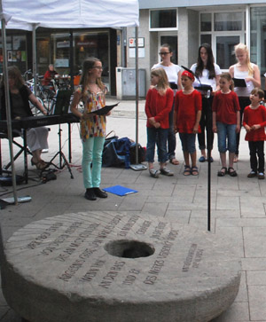 ![]() Foto: privat Mitglieder des Kinder- und Jugendchores der Musikschule Hildesheim e. V. sehen sich vor Beginn der Veranstaltung den "Mahnenden Mühlstein" an. |