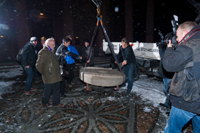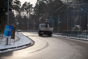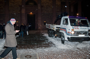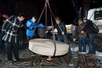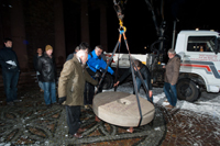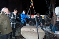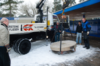 Der Mühlstein auf dem Wege in die City von Karlsruhe | Ankunft des Mühlsteins vor St. Stephan Den Transport übernahm Herr Mall von der Firma Rothweiler & Mall, Natursteine & Fliesen in Karlsruhe |