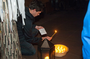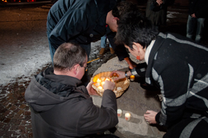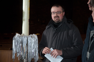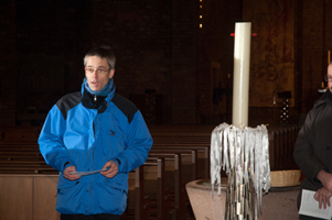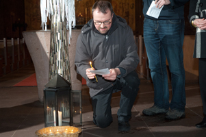Jugendpfarrer Fritz entzündet gemeinsam mit einem jungen Mann das "Friedenslicht aus Bethlehem". (zum Vortrag: hier) |