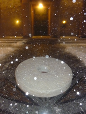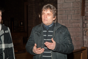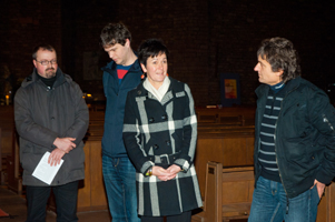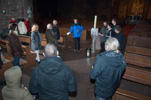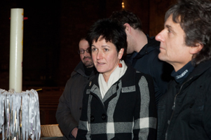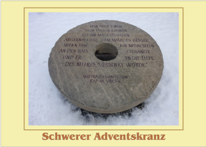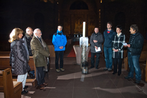 Unser Versuch, die Kerzen auf dem Mühlstein zu entzünden, scheiterte wegen der Wetterverhältnisse. Wir mussten abbrechen und die Veranstaltung in der Kirche fortsetzen. | |