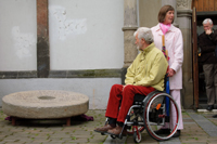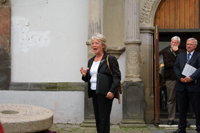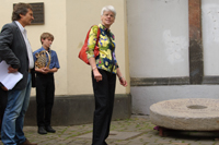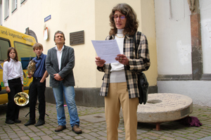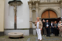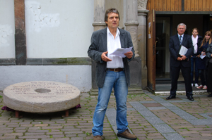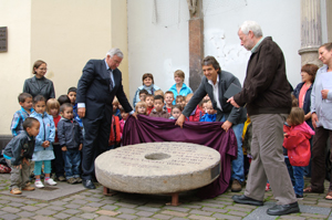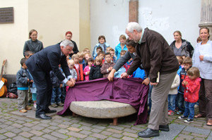 ![]() ![]() Enthüllung des "Mahnenden Mühlsteins" vor dem Kreuz der Citykirche. v. l. n. r.: Oberbürgermeister Prof. Dr. Joachim Hofmann-Göttig, Johannes Heibel und Martin Königstein vom Team der Citykirche |