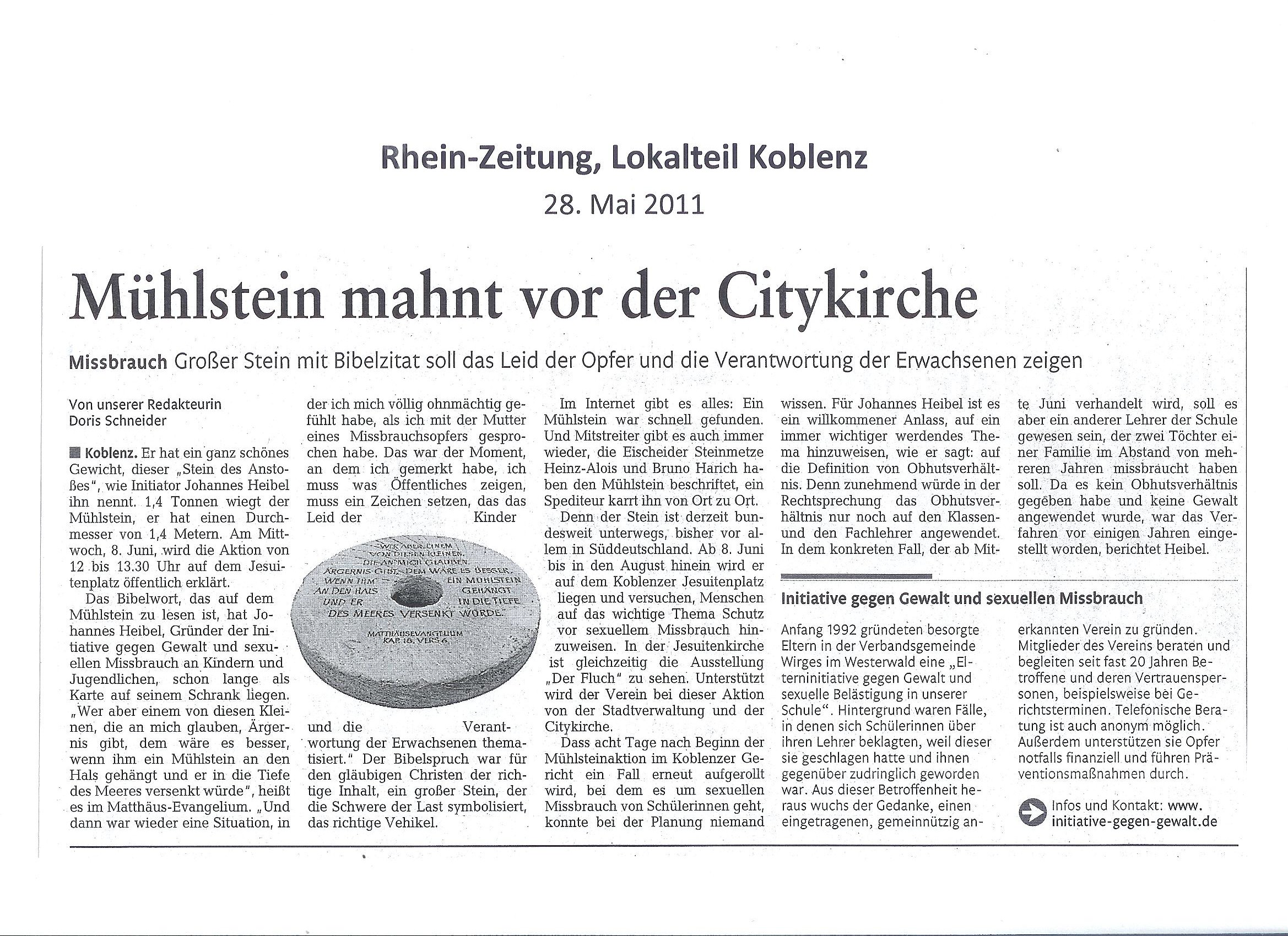 Oberbürgermeister Prof. Dr. Hofmann-Göttig bei seiner Eröffnungsrede Sein Statement zur Aktion "Mahnender Mühlstein": "Körperliche Gewalt - gar noch mit sexuellem Hintergrund - gegen Kinder ist ein Verbrechen, auch im häuslichen Umfeld. Es kommt leider häufiger vor, als man denkt und wirkt nicht selten Jahrzehnte nach. Deshalb müssen wir Öffentlichkeit herstellen, über das Problem sprechen, es enttabuisieren. Das ist das Einzige, was hilft. Daher begrüße ich die Mahnmal-Aktion. Prof. Dr. Joachim Hofmann-Goettig Oberbürgermeister der Stadt Koblenz" |