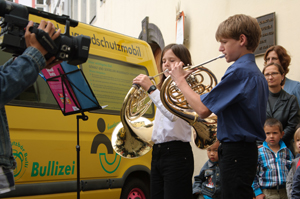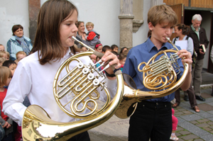 ![]() ![]() Waldhorn-Duo Jakob Rensinghoff und Raphael Böhler von der Städtischen Musikschule Koblenz gaben der Veranstaltung den würdigen Rahmen. |