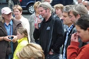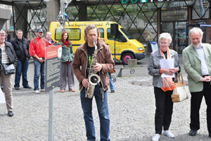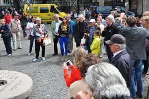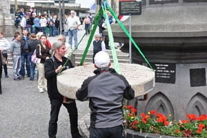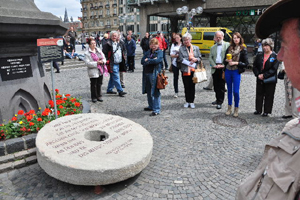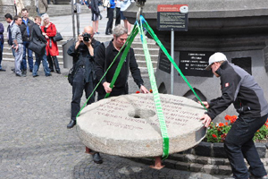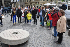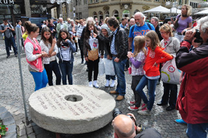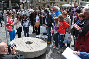 Johannes Heibel bezieht Jugendliche mit ein und lässt sie den Text auf dem Mühlstein vorlesen.