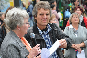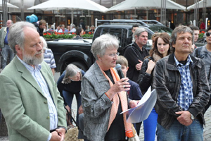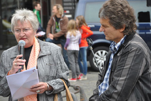 Hannelore Bartscherer, Vorsitzende des Katholikenausschusses in Köln, bei ihrer Rede vor der Kreuzblume am Dom.