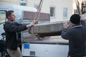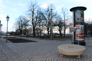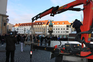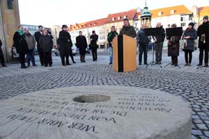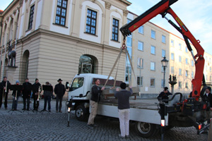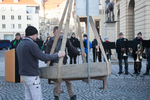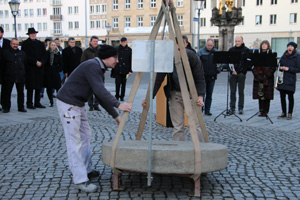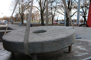 Versetzung des "Mahnenden Mühlsteins" durch das Team des Bau- und Natursteinbetriebs Paul Schuster GmbH aus Magdeburg |