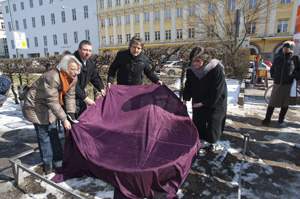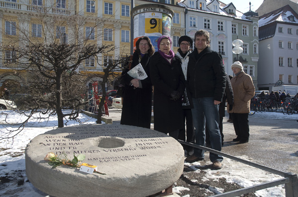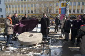 ![]() ![]() Fotos: Frank Hügle, Karlsruhe Enthüllung des "Mahnenden Mühlsteins" v. l. n. r.: Stadträtin Lydia Dietrich (Die Grünen/RosaListe; Vorsitzende der Stadtratskommission zur Gleichstellung von Frauen), Stadtrat Christian Müller (Fraktion der SPD; hier als Vetretung der Bürgermeisterin), Johannes Heibel und ganz rechts im Bild Dr. Maria Kurz-Adam (Leiterin des Stadtjugendamtes München) |