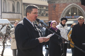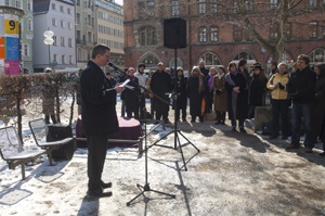 Auszug aus seiner Rede: "... Jetzt - ..., passend zum 20-jährigen Bestehen der UN-Kinderrechtecharta - und im Jahr des ökumenischen Kirchentages, wird uns die Ehre zuteil, in München den 'Mahnenden Mühlstein' zu enthüllen. Er wird hier nur zu Gast sein und Ende des Monats März nach Bamberg weiterwandern. Der Monat März ist bei uns dem Recht auf Schutz vor Ausbeutung und Gewalt aus der UN-Kinderrechtecharta gewidmet. Wir danken:der Initiative gegen Gewalt und sexuellen Missbrauch an Kindern und Jugendlichen, Dompfarrer Wolfgang Huber, Pfarrerin Verena Übler, Ev. Lutherkirche ... (lesen Sie hier ihre Rede aus dem gemeinsamen Mittagsgebet zuvor im Dom:), der Gleichstellungsstelle des Erzbischöflichen Ordinariats München und Freising, der Frauengleichstellungsstelle der Evangelisch-Lutherischen Kirche in Bayern und der Gleichstellungsstelle der Stadt München. Möge der Mühlstein ein Stück Würde für die betroffenen Mädchen und Jungen zurück bringen und eine Mahnung zur Wachsamkeit an uns alle sein." |
