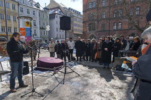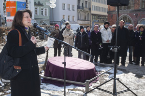 Michaela Pichlbauer betonte, dass das Gewicht des Mühlsteins auch symbolisch für die Kraftanstengung des Veranstalters stehe. Die Verwirklichung der Aktion "Mahnender Mühlstein" sei immer auch mit einer großen Kraftanstrengung verbunden. Es gelte erst einmal viele Widerstände zu überwinden, ehe der Mühlstein dann von einem zum anderen Ort gebracht werden könne. |