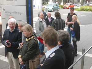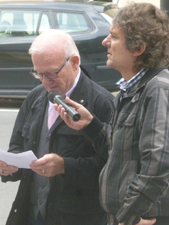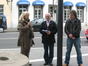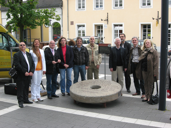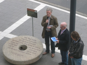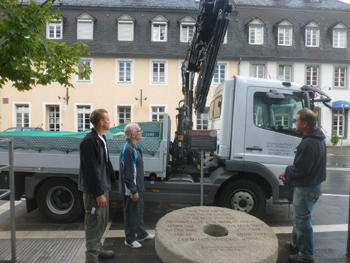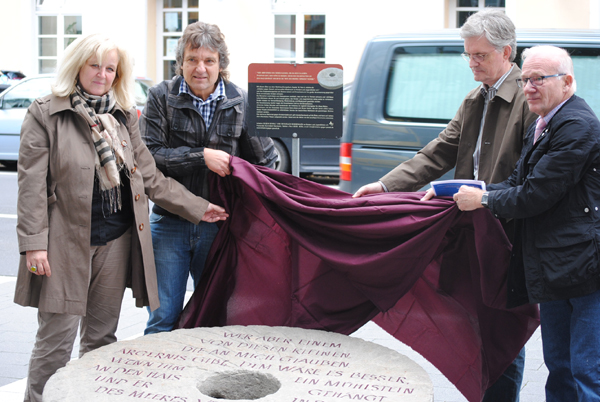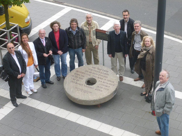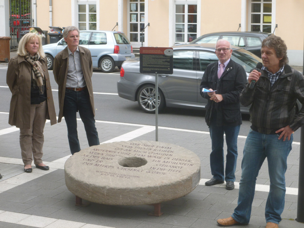 nimmt den "Mahnenden Mühlstein" einige Tage zuvor von Mitarbeitern der Steinmetzwerkstatt Bruno Harich entgegen.