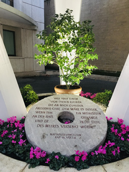 Der "Mahnende Mühlstein hat nun vor dem Sitz der Päpstlichen Kinderschutzkommission am Largo Giovanni Paolo II, hinter der Audienzhalle Paul VI., seinen Platz gefunden, so Pressesprecher Matteo Bruni auf Anfrage der Katholischen Nachrichen-Agentur (KNA).