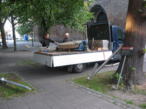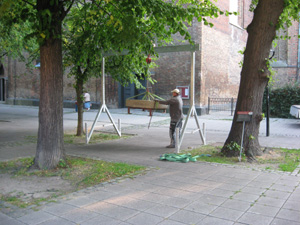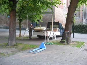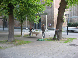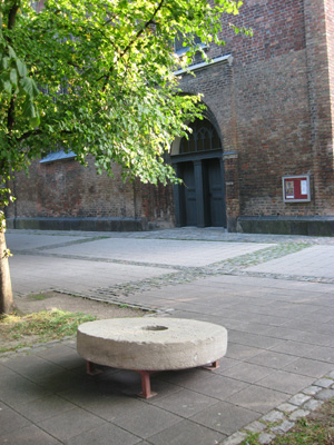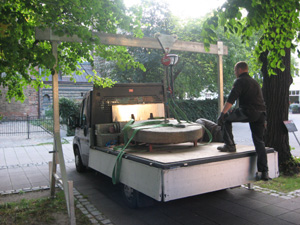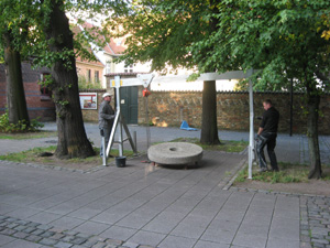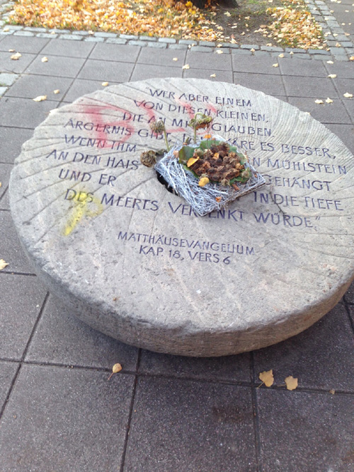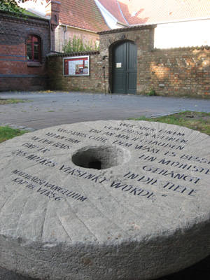 18. September 2015 Versetzung des "Mahnenden Mühlsteins" durch das Team des Steinmetzbetriebs Thomas Scheinpflug aus Rostock |