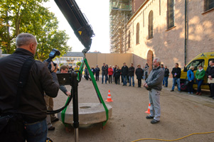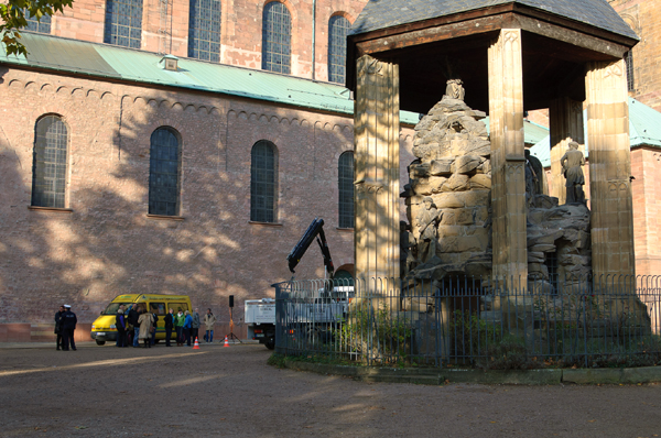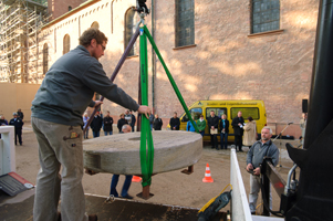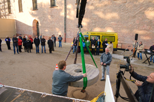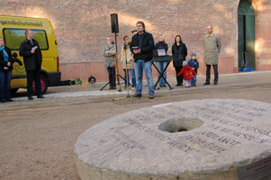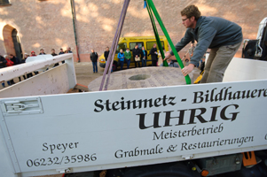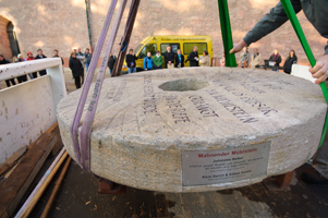 ![]() Versetzung des Mühlsteins durch den Speyerer Steinbildhauermeister Hans Tobias Uhrig und seinen Sohn. |