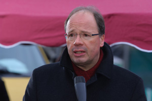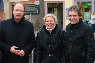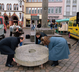 Johannes Heibel bittet Bischof Ackermann und Bürgermeisterin Birk zum Mühlstein.