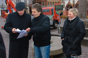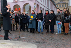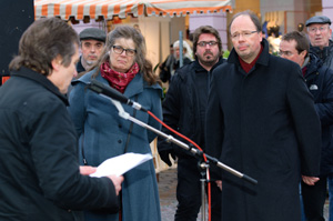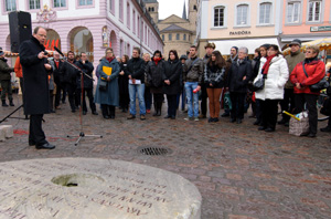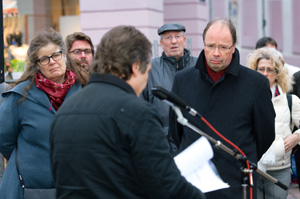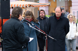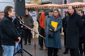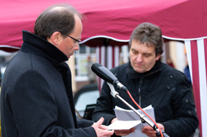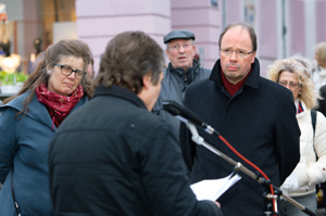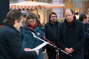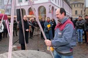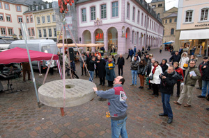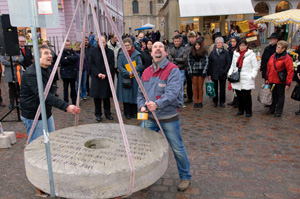 Man versucht nun den Mühlstein, der auch die Last der Opfer symbolisieren soll, gemeinsam anzuheben. Erfolglos. Der Vorsitzende der Initiative appelliert daraufhin an alle Bürgerinnen und Bürger dabei mitzuhelfen, die Last der Opfer zu tragen, denn nur gemeinsam könne man es schaffen.