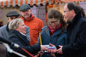 Monika Heibel überreicht Bischof Ackermann und Bürgermeisterin Birk zum Dank ein Buchgeschenk. |