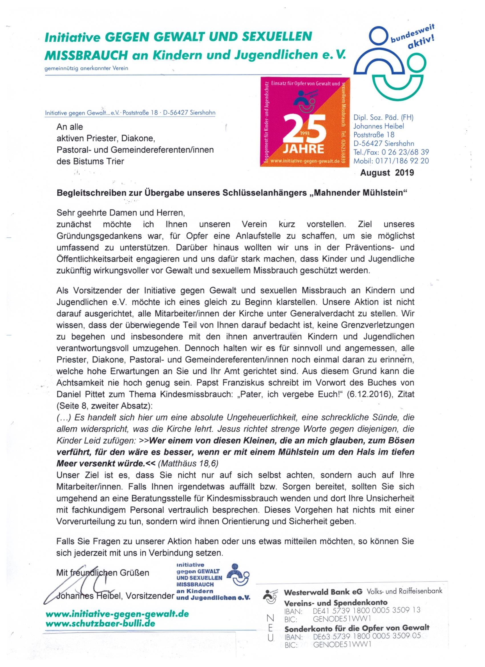 Mühlstein-Schlüsselanhänger für alle aktiven Priester, Diakone, Pastoral- und Gemeindereferentinnen/Gemeindereferenten im Bistum Trier Anhänger erinnern an Verantwortung Bistum Trier unterstützt Mühlstein-Aktion Pressemitteilung der Bischöflichen Pressestelle des Bistums Trier, lesen: hier Begleitschreiben der Initiative, lesen: hier Die Übergabe der Schlüsselanhänger am 13.8.2019 im Generalvikariat des Bistums Trier. |