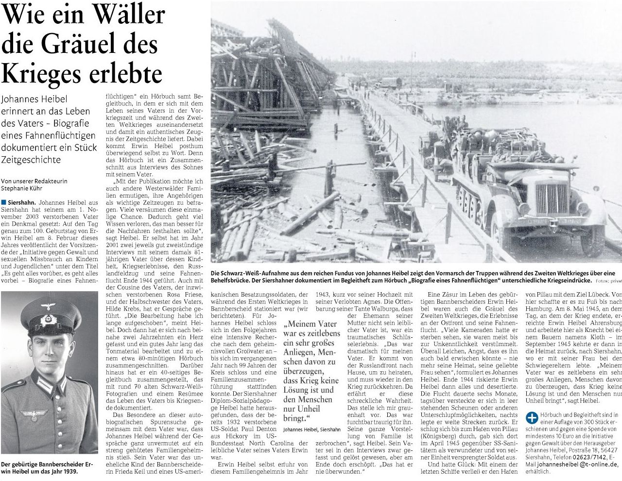 Wie ein Wäller die Gräuel des Krieges erlebte Johannes Heibel aus Siershahn hat seinem am 1. November 2003 verstorbenen Vater ein Denkmal gesetzt: Auf den Tag genau zum 100. Geburtstag von Erwin Heibel am 8. Februar dieses Jahres veröffentlicht der Vorsitzende der „Initiative gegen Gewalt und sexuellen Missbrauch an Kindern und Jugendlichen“ unter dem Titel „Es geht alles vorüber, es geht alles vorbei Biografie eines Fahnenflüchtigen“ ein Hörbuch samt Begleitbuch, in dem er sich mit dem Leben seines Vaters in der Vorkriegszeit und während des Zweiten Weltkrieges auseinandersetzt und damit ein authentisches Zeugnis der Zeitgeschichte liefert. Dabei kommt Erwin Heibel posthum überwiegend selbst zu Wort. Denn das Hörbuch ist ein Zusammenschnitt aus Interviews des Sohnes mit seinem Vater. "Wie ein Wäller die Gräuel des Krieges erlebte", Westerwälder Zeitung vom 21.01.2020, Seite 21, Autorin: Stephanie Kühr Artikel (mit freundlicher Genehmigung der Westerwälder-Zeitung/ Rhein-Zeitung) lesen: hier