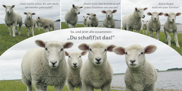 Schäfchen als MUT-Macher für Menschen, die zum Beispiel vor einer Prüfung stehen, erkrankt sind oder sonstiges Leid erlitten haben. ![]() Neu im Shop: "Plakat Schafsquartett": 2 € + Versandkosten "Postkarte Schafsquartett": 1 € + Versandkosten Plakate und Postkarten können direkt über unsere Initiative (Shop) bezogen werden. |