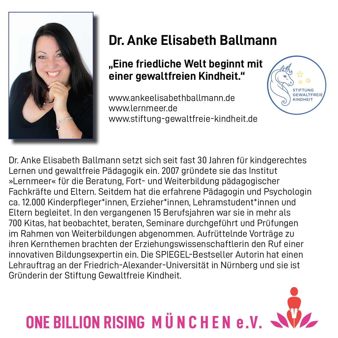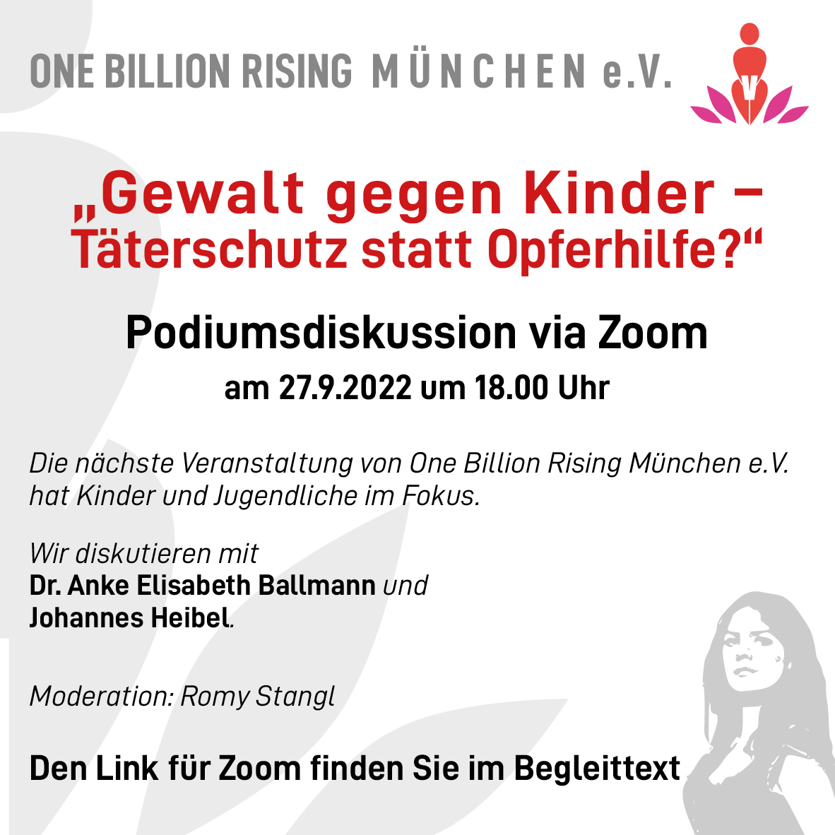 Podiumsduskussion zum Thema: "Gewalt gegen Kinder - Täterschutz statt Opferhilfe?" Zoom-Meeting beitreten: https://us02web.zoom.us/j/82320048003?pwd=d0xkZTB6aEd3bDZKVHVwRW9QeTZkQT0 Die nächste Veranstaltung von One Billion Rising München e.V. hat Kinder und Jugendliche im Fokus. Die Podiumsdiskussion zum Thema: „Gewalt gegen Kinder Täterschutz statt Opferhilfe?“ findet via Zoom am 27.9.2022 um 18.00 Uhr statt. Wir diskutieren mit Dr. Anke Elisabeth Ballmann und Johannes Heibel. Moderation: Romy Stangl. Dr. Anke Elisabeth Ballmann ist Psychologin, Pädagogin, Autorin und Gründerin des Instituts „Lernmeer“. Seit 30 Jahren setzt sie sich für eine gewaltfreie Pädagogik und kindgerechtes Lernen ein. Johannes Heibel der Vorsitzende der „Initiative gegen Gewalt und sexuellen Missbrauch an Kindern und Jugendlichen e.V.“ hat aktuell das Buch „Schuldzeit“ herausgegeben, in dem Übergriffe auf Schüler*innen an staatlichen Schulen durch Lehrpersonal thematisiert werden. Außerdem hat er das Präventionsprojekt „Schutzbär Bulli“ für Kinder im Grundschulalter initiiert. Auch er sieht sich bereits seit über 30 Jahre mit dem Thema konfrontiert. Er und die Mitglieder der Initiative engagieren sich auf rein ehrenamtlicher Basis. Wir freuen uns über eure Teilnahme und Diskussionsbeiträge. One Billion Rising München e.V. lädt Sie zu einem geplanten Zoom-Meeting ein. |