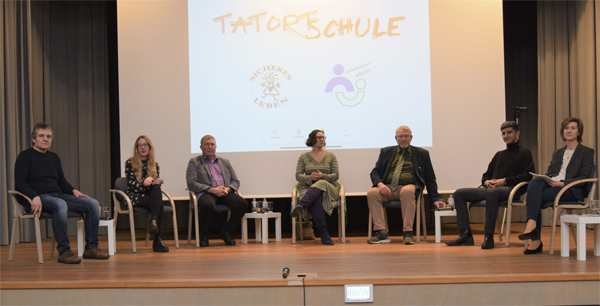 in der Akademie für Lehrerfortbildung und Personalführung Dillingen, (von links) Initiator Johannes Heibel, Betroffene Maike, Polizeidirektor a. D. Rainer Becker, Opfer-Anwältin Isabel Kratzer-Ceylan, Artikel von Michael Mittelstaedt und Claudia Thum, Einladungsflyer lesen: hier |