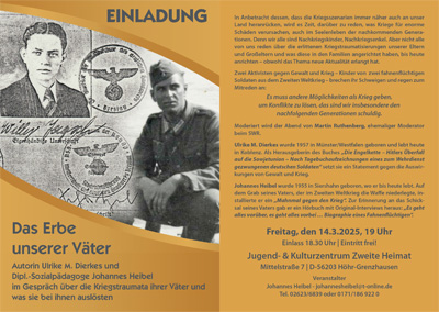 Das Erbe unserer Väter Ulrike M. Dierkes und Johannes Heibel im Gespräch über die Kriegstraumata Freitag, den 14.3.2025, 19 Uhr Jugend- & Kulturzentrum Zweite Heimat |
