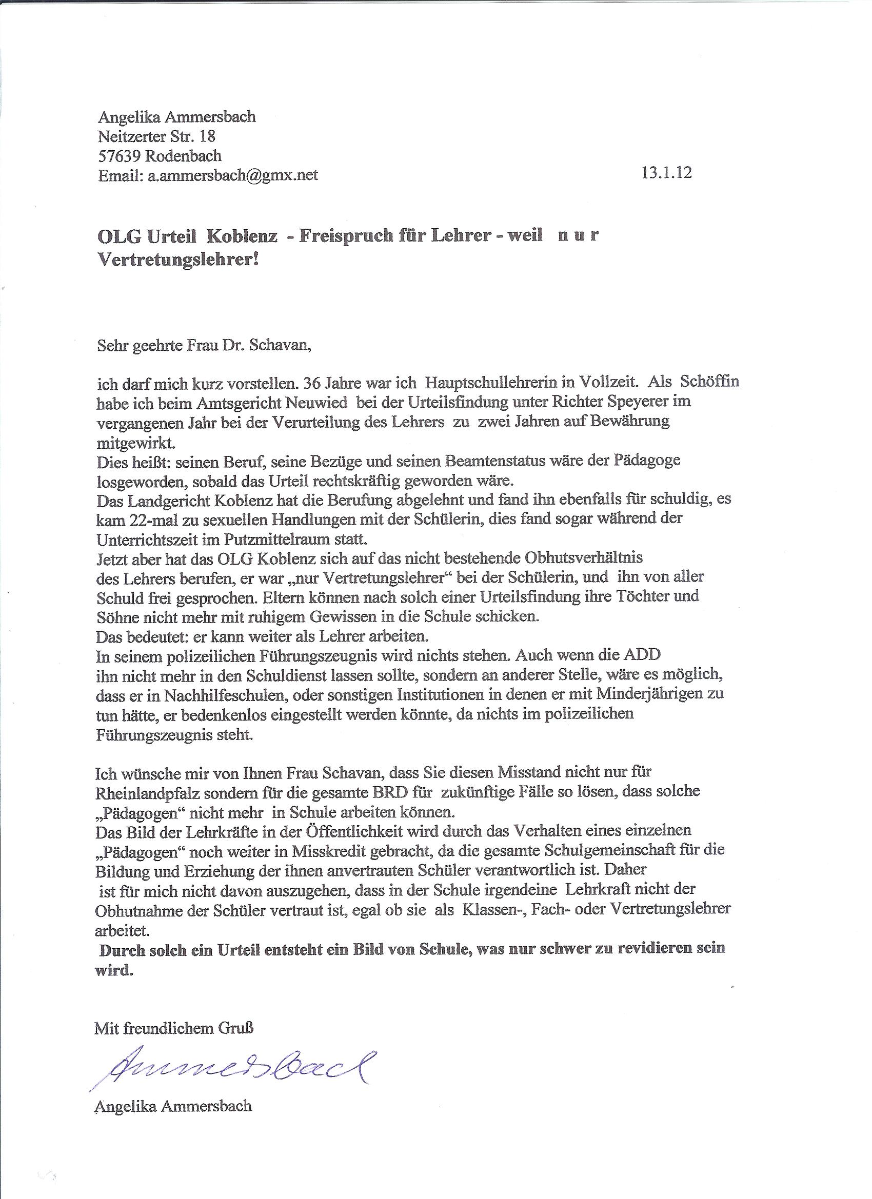 General-Anzeiger, Landespolitik/Seite 5, 15.8.2012 "Missbrauchsfall in Neuwied - Weitere Schüler zeigen Lehrer an", Spiegel-online, 14.8.2012 "Sex mit Schülerin: Neue Vorwürfe - Justiz Betroffene schildern Erlebnisse - Vier Anzeigen belasten Lehrer schwer", Rhein-Zeitung, Seite 1, Autor: Mario Quadt, 11.8.2012 "Die Masche des 'Honigbären'", Rhein-Zeitung, Journal, Autor: Mario Quadt, 11.8.2012 "Disziplinarverfahren gegen Neuwieder Lehrer eingestellt - Reaktion Sex mit Schülerin: Umstrittener Pädagoge gab seinen Beamtenstatus freiwillig auf", Rhein-Zeitung, Seite 3, 8.8.2012 "Sex mit 14-Jähriger - Disziplinarverfahren eingestellt", Welt online, Autor: Kristian Frigelj, 7.8.2012 "Sex mit Schülerin: Staatsanwälte ermitteln - Justiz Lehrer aus dem Kreis Neuwied beantragt Entlassung aus dem Beamtenverhältnis - Weitere Eltern stellen Strafanträge", Rhein-Zeitung Koblenz, Seite 3, Autor: Mario Quadt, 18.7.2012 Es geht also auch anders! Mittlerweile hat das Bistum Trier dem Religionslehrer gekündigt. "Realschullehrer fristlos gekündigt: Verdacht: Verhältnis zu einer minderjährigen Schülerin" Quelle: http://www.rundumboppard.net/ Meldung vom 15.06.2012, Autor: Ralf Hübner "Wie stoppt man Sex-Lehrer? - Missbrauch Länder streiten um Gesetz - Bayern: Unerträgliche Lücke - Mainz hat Beratungsbedarf", Rhein-Zeitung, Seite 1, Autorin: Ursula Samary, 13.6.2012 "Schutz vor Missbrauch gehört nicht auf die lange Bank", Rhein-Zeitung, Seite 2 / Forum, Kommentar von Ursula Samary, 13.6.2012 "Schutz mit Lücke - Sex zwischen Lehrern und Schülerinnen bewerten Gerichte höchst unterschiedlich. Die Justizminister beraten nun über eine Verschärfung der Gesetze.", Magazin "Der Spiegel", Heft 21/2012, Seite 45, Autor: Jan Friedmann, 21.5.2012 "ADD will Sex-Lehrer loswerden - Justiz Schulaufsicht geht vor Verwaltungsgericht", Rhein-Zeitung, Seite 3, Autor: Mario Quadt, 4.5.2012 "Sex mit Schülerin: ADD will zweite Klage - Missbrauch Schulbehörde möchte Fall aus der Referendarzeit des Lehrers aus dem Kreis Neuwied vor Gericht aufrollen", Rhein-Zeitung, Lokalteil Neuwied, Seite 17, Autor Mario Quadt, 4.5.2012 "Sex mit Schülerin: Familie fordert Anklage", Rhein-Zeitung, Lokalteil Neuwied, Autor: Mario Quadt, S. 17, 25.4.2012 "Sex mit Schülerin: Familie kämpft weiter", Rhein-Zeitung, Kompakt, Seite 3, 25.4.2012" "Fazit: Der Gesetzgeber soll nachbessern", General-Anzeiger online, Lokalausgabe Bad Honnef, Autorin: Annette Claus, 13.4.2012 "Missbrauch in der Schule - Initiative gegen eine Gesetzeslücke", Magazin "Stern", Heft Nr. 16, Seite 6, 12.4.2012 "Sex mit Schülerin: Keine Anklage gegen Lehrer", Rhein-Zeitung, Lokalteil Neuwied, Autor Mario Quadt, 10.4.2012 "ADD klagt gegen Sex-Lehrer - Prozess Behörde will, dass 37-Jähriger aus dem Kreis Neuwied nie mehr unterrichtet", Rhein-Zeitung, Titelseite, Autor: Hartmut Wagner, 5.4.2012 "Kritik an der Schulaufsicht - Ministerium bemängelt Disziplinarverfahren", General Anzeiger, Lokalteil Bad Honnef, Seite 17, 20.3.2012 "OLG-Sprecher: Lassen die Bürger nicht alleine", Rhein-Zeitung, Lokalteil Neuwied, Autor: Mario Quadt, 13.3.2012 "Gericht lässt Bürger allein - Missbrauch Kein OLG-Richter bei Diskussion über Freispruch - Schulbehörde will Ausbildung ändern", Rhein-Zeitung, Lokalteil Neuwied, Autor: Hartmut Wagner, Seite 20, 10.3.2012 "Schelte für Schulaufsicht - Podiumsdiskussion 'Übergriffe durch Lehrpersonal' im Asbacher Bürgerhaus", General-Anzeiger, Lokalteil Bad Honnef, Autorin: Gabriele Quarg, Seite 19, 10.3.2012 "Pressemitteilung der KMK vom 9.3.2012" "Sex mit Schülerin: Lehrer landet mit Masche - Zeitleiste Die RZ dokumentiert kompletten Fall", Rhein-Zeitung, Lokalteil Neuwied, Autor: Mario Quadt, 8.3.2012 "Entscheidung des OVG Rheinland-Pfalz: Sex mit Schülern ist ein Dienstvergehen", General-Anzeiger, Autorin: Annette Claus, 8.3.2012 "Nach Affäre mit Schülerin - Bayern will Sex-Gesetz gegen Lehrer verschärfen", Welt online, Autor: Peter Issig, 7.3.2012 "Missbrauch: Lehrer muss gehen - Urteil Disziplinarrechtliche Höchststrafe ist nach einem Übergriff auf minderjährige Schüler die Regel", Rhein-Zeitung, Autorin: Ursula Samary, 2.3.2012 "Sex mit Schülerin: Diskussion über OLG-Beschluss", Rhein-Zeitung, Lokalausgabe Neuwied, Autor: Mario Quadt, 2.3.2012 "Sex mit Schülerin: Lehrer verklagt Opfervater", Rhein-Zeitung, Lokalteil Neuwied, Autor: Mario Quadt, 24.2.2012 "Sexlehrer verklagt Vater von Schülerin", Rhein-Zeitung, Seite 3, Autor: Mario Quadt, 24.2.2012 "Initiative fordert: Missbrauch durch Lehrer darf nicht folgenlos bleiben", Rhein-Zeitung, Lokalteil Neuwied, Autor: Mario Quadt, 9.2.2012. "Schutzlose Zone Schule", Radioreport Recht, SWR 1, 31.1.2012 "Frauennotrufe in Rh.-Pfalz kritisieren den Freispruch ...", Pressemitteilung, Januar 2012 "Sex-Lehrer: Weitere Fälle tauchen auf", Rhein-Zeitung, Seite 1, Autor: Mario Quadt, 28.1.2012 "Er hat doch niemand vergewaltigt", MOPO Hamburg, Seite 7, Autor: Olaf Wunder, 26.1.2012 "Sex-Lehrer: Staatsanwälte ermitteln erneut", Rhein-Zeitung, Seite 1, Autor: Mario Quadt, 24.1.2012 "Honigbär und Heuchler", Rhein-Zeitung, Journal-Seite, Autor: Mario Quadt, 21.1.2012 "Missbrauch: Ahnen in der Kritik", Rhein-Zeitung, Seite 1, Autor: Mario Quadt, 21.1.2012 "Schülerin redet über Affäre mit ihrem Lehrer", Ostthüringer Zeitung, 20.1.2012 "Es lief immer auf Sex hinaus - Schülerin Anna erzählt, wie ein Lehrer sie ausnutzte - und am Ende straffrei ausging", Die Welt, Seite 27, Autor: Kristian Frigelj, 18.1.2012 „Gericht wehrt sich gegen Kritik am Lehrer-Freispruch“, Die Rheinpfalz, 18.1.2012 "Eltern zeigen sich fassungslos über Freispruch des Oberlandesgerichts", Pressemeldung des Landeselternbeirates Rh.- Pfalz, 16.1.2012 "Freispruch für Lehrer: Schöffen klagen an", ( und: Bad Breisig: Schöffen unterstützen die Initiative!) Rhein-Zeitung, Seite 3, 16.1.2012 "Lehrerfreispruch löst Welle der Empörung aus - Sex mit Schülerin - Kinderschutzbund: Skandalurteil", Die