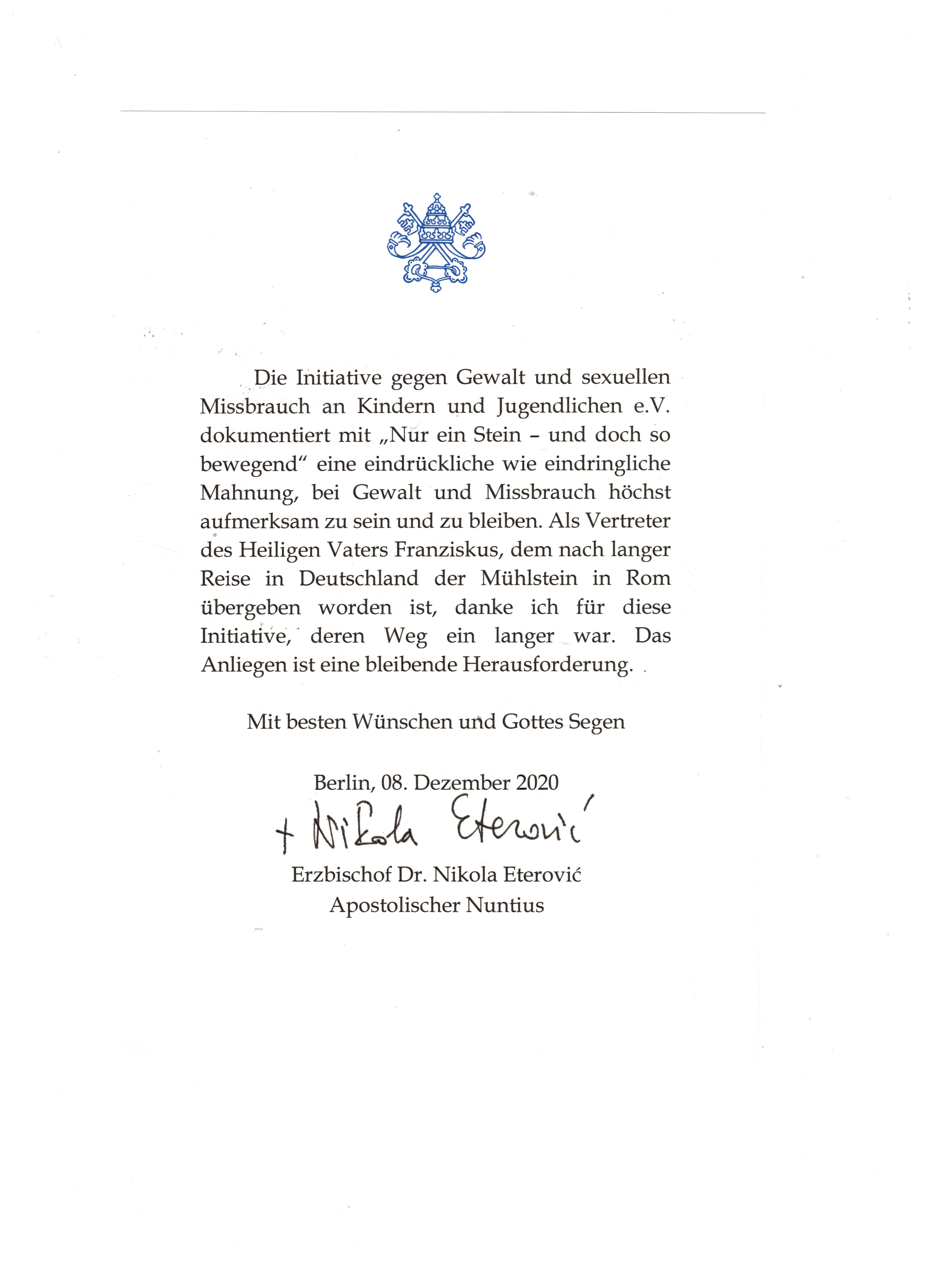 Geplante Übergabe unseres “Mahnenden Mühlsteins" an Papst Franziskus in Rom, 27.11.2019 Am 18.11.2019 erreichte uns nun die endgültige Zusage von der Nuntiatur in Berlin. Wir sind erleichtert und freuen uns auf Rom. Am Samstag, den 23.11.2019 werden wir gegen 3.30 Uhr in der Früh nach Würzburg aufbrechen. Nachdem wir dort gegen 6.30 Uhr den Mühlstein auf unseren Anhänger geladen haben, fahren wir über Österreich bis nach Bologna oder vielleicht sogar Pisa. Dort werden wir einen Zwischenstopp einlegen und übernachten. Am Morgen des 24.11. setzen wir die Fahrt nach Rom fort. Wir hoffen, dass wir am Abend des 24.11. unser Quartier, das in unmittelbarer Nähe von St. Peter liegt (15 Gehminuten entfernt), erreichen. Die Übergabe unseres Mühlsteins an Papst Franziskus soll am 27.11. stattfinden.