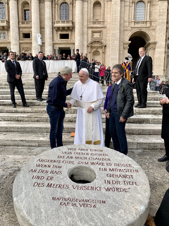 Übergabe unseres Mahnenden Mühlsteins an Papst Franziskus auf dem Petersplatz