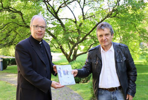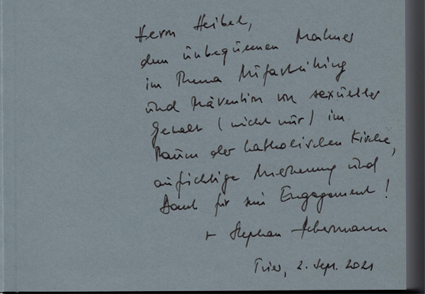 Vorsitzender übergibt dem Trierer Bischof Dr. Stephan Ackermann den Bildband über die bundesweiten Aktion "Mahnender Mühlstein" Am 2.Sept. 2021 übergab Johannes Heibel (Vorsitzender der Initiative gegen Gewalt und sexuellen Missbrauch an Kindern und Jugendlichen e.V.) dem Trierer Bischof Dr. Ackermann zwanzig Bildbände. |