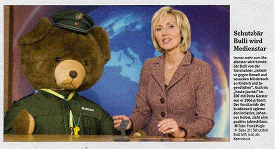 Zeitung, Immer mehr zum Medienstar wird Schutzbär Bulli von der Siershahner "Initiative gegen Gewalt und sexuellen Missbrauch an Kindern und Jugendlichen". Auch im "heute journal" im ZDF mit Petra Gerster war er 2006 präsent. Der Vorsitzende der bundesweit agierenden Initiative, Johannes Heibel, zieht eine positive Jahresbilanz. Foto: Frank Hügle, Karlsruhe |