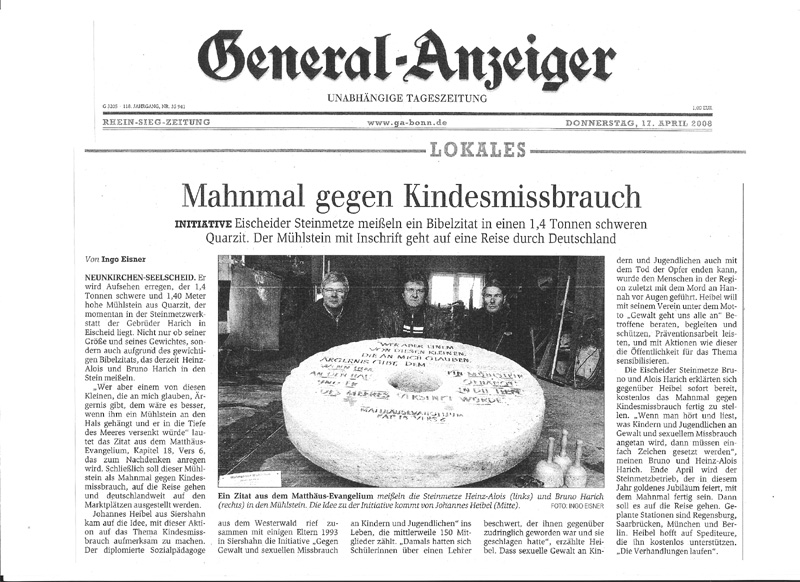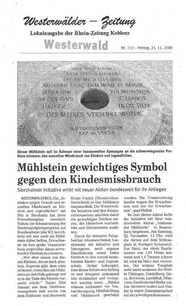 "Mühlstein gewichtiges Symbol gegen Kindesmissbrauch - Siershahner Initiative wirbt mit neuer Aktion bundesweit für ihr Anliegen", Rhein-Zeitung, Lokalausgabe: Westerwälder-Zeitung, 21.11.2008 und General-Anzeiger vom 17.04.2008