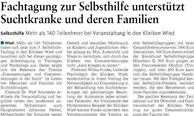 Presseartikel Fachtagung zur Selbsthilfe unterstützt Suchtkranke und deren Familien" Westerwälder Zeitung, 23.6.2015, Artikel lesen: hier |