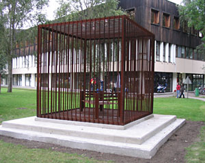 mal nach! Dem Betrachter zeigt sich ein quaderförmiger Käfig (im Original 3m x 3m x 3m, Modell im Maßstab 1:10) aus Eisen ohne irgend einen Zugang. Im Innern des Prangers steht ein Bett aus gleichem Material, worauf die „Bild am Sonntag“ mit dem bekannten Zitat des Bundeskanzlers liegt. Mit dem Mahnmal beabsichtigt die Initiative keine bestimmte Forderung zu vertreten. Die Installation soll vielmehr die Menschen zum Nachdenken anregen und für das Thema sensibilisieren. Kindesmissbrauch zu verhindern muss letztlich unser aller Bestreben sein. Dazu soll das Mahnmal Anstoß geben und Denk-Prozesse in Gang setzen helfen. |
