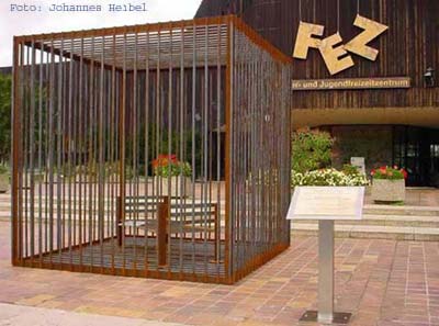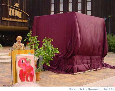 Eröffnung der Denk mal nach!-Ausstellung in 2002 Das Original des Mahnmals wird präsentiert vor dem FEZ Freizeitzentrum in Berlin Köpenick |
