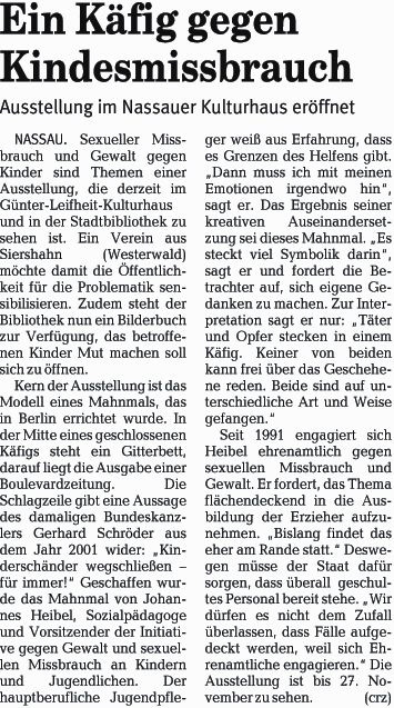 Bürgermeister der Stadt Nassau "Eine glückliche Kindheit ist ein Brunnen, aus dem ein Mensch sein Leben lang schöpfen kann. Umso schlimmer ist es, wenn dieser Brunnen durch fehlende Zuwendung austrocknet oder sogar durch Gewalt und sexuellen Missbrauch vergiftet wird. Menschen, denen dies widerfährt, werden nicht nur einer glücklichen Kindheit beraubt. Ihnen werden Schmerzen und Leid für das ganze Leben zugefügt. Ein Wort von Willy Brandt sagt alles: „Wer helfen will, muss Kindern helfen". Helfen wir ihnen, dass sie eine glückliche Kindheit erleben können. Dazu muss jede Gewalt und sexueller Missbrauch verhindert werden. Kinder können sich nicht selbst gegen erwachsene Täter schützen. Das müssen wir, jeder Einzelne von uns, tun. Die Ausstellung im Günter-Leifheit-Kulturhaus kann und muss uns dafür die Augen wieder öffnen." |